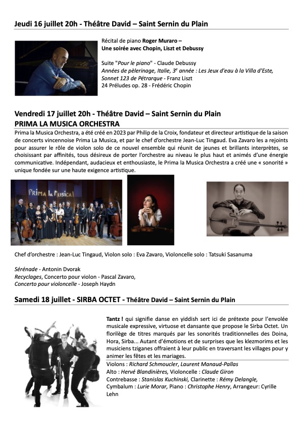 Après deux années aux côtés des Percussions Claviers de Lyon, c’est avec Eva Zavaro que nous avons imaginé cette nouvelle édition. Considérée comme l’une des plus brillantes violonistes de sa génération, Eva Zavaro a accompagné Inès Sciortino tout au long de l’année pour la programmation du festival. C’est cette codirection artistique qui nous permet, cette année, de vous proposer un festival riche en couleurs et textures musicales : des Révélations qui font leur cinéma, Roger Muraro au piano, un ensemble orchestral avec deux concertos et un octet de musiques traditionnelles d’Europe de l’Est … cette année encore, le Théâtre David accueillera la musique dans toute sa diversité et son enchantement.