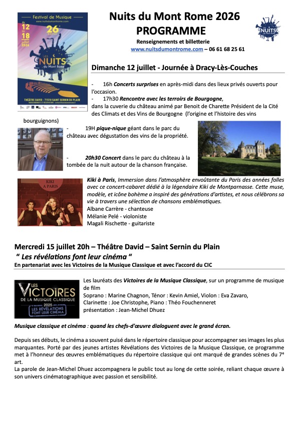 Comme chaque année depuis maintenant 12 ans, le festival sera aussi l’occasion pour de jeunes musiciens de pratiquer leur instrument lors d’un stage de musique de chambre qui se déroulera du 6 au 12 juillet. Accompagnés par Maria Giota, Elisabeth Glab et Aliisa Neige Barrière, ils viendront se perfectionner le temps d’une semaine dans notre campagne bourguignonne. Le dimanche 12 juillet, c’est la magnifique commune de Dracy-lès-Couches qui nous ouvrira ses portes pour une après-midi musicale pleine de surprises. Cette journée, imaginée en partenariat avec Quentin de Charette, se terminera dans l’enceinte du Château de Dracy, où l’on explorera le lien ténu et étroit entre vins et musiques. Et pour terminer en apothéose, un hommage à Kiki de Montparnasse dans le parc du Château, après un pique-nique bucolique.